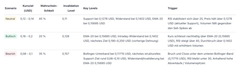 Widerstände: 0,1402 USD (Intraday-High) und 0,15685 USD (EMA-20). Ein nachhaltiger Ausbruch über 0,15685 USD würde das Kurzfrist-Risiko mindern; ein Bruch unter 0,11715 USD würde Ausweitung der Abwärtsbewegung wahrscheinlich machen.