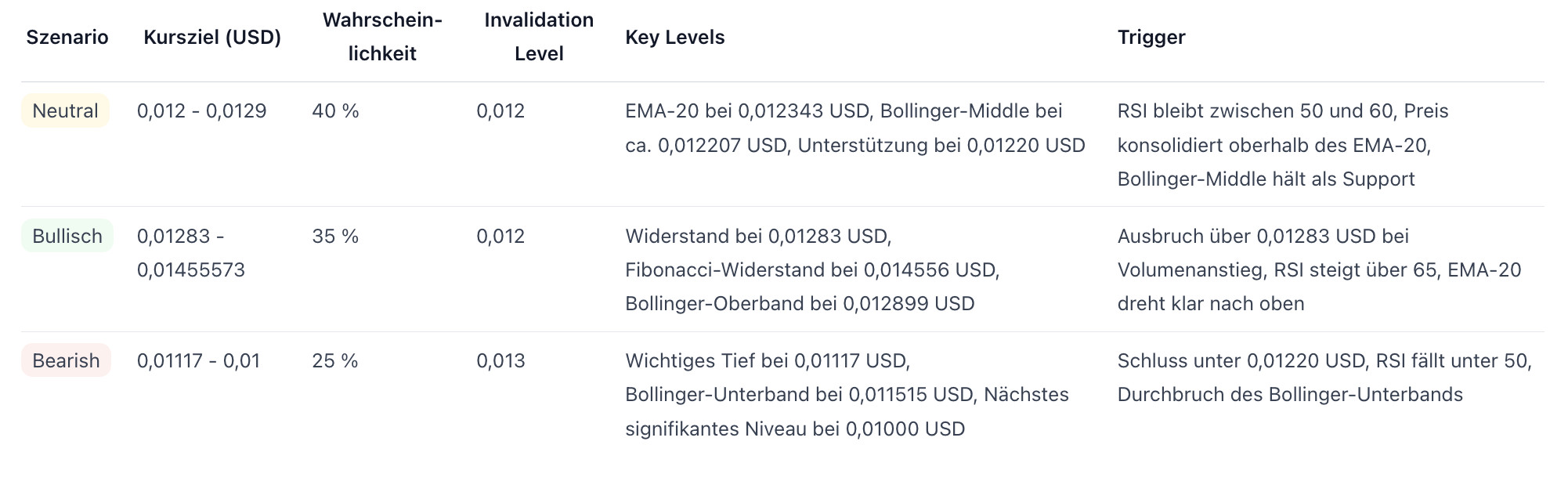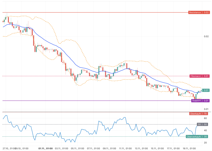 Die Bollinger‑Bänderbreite beträgt aktuell ca. 0,001385 USD (Upper 0,012899 USD − Lower 0,011515 USD) und ist moderat geöffnet. Der Markt befindet sich in einer kurzfristigen Erholungsphase nach dem vorherigen Abverkauf (Fibonacci: Abwärtstrend), mit erhöhter, aber nicht extrem ausgeprägter Volatilität.