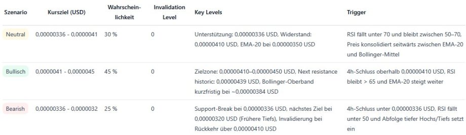 Ein nachhaltiger Schlusskurs über 0,00000410 US-Dollar innerhalb der Vier-Stunden-Range könnte die nächste Aufwärtsbewegung auslösen. Fällt der Kurs dagegen unter 0,00000336 US-Dollar, steigt das Risiko einer tieferen Korrektur in Richtung 0,00000320 US-Dollar.
