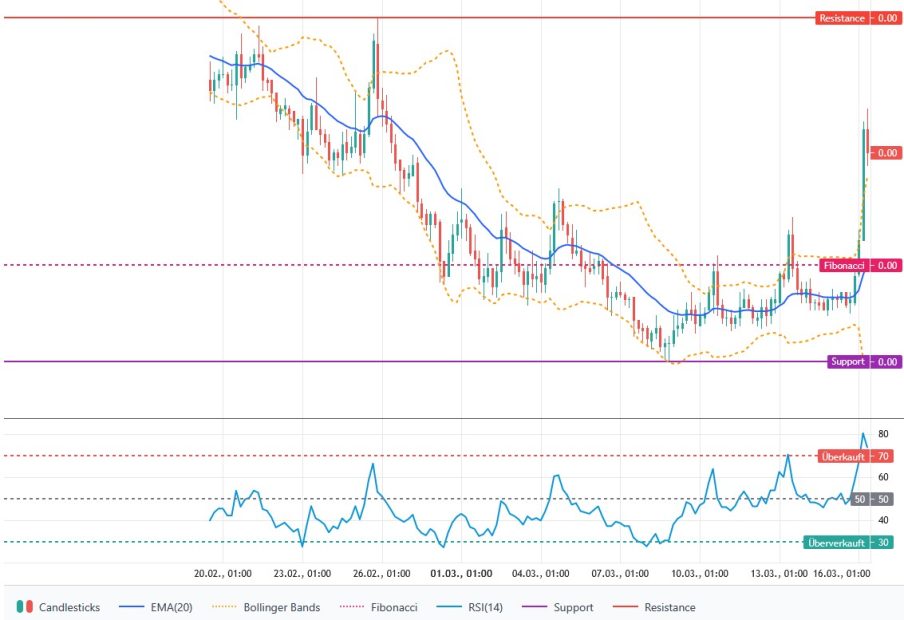 Die kurzfristige Prognose für PEPE am 16.03.2026 bleibt bullish. Ausschlaggebend dafür sind der klare Schlusskurs oberhalb des EMA-20 und das weiterhin starke Momentum, auch wenn der hohe RSI bereits auf eine überkaufte Lage hinweist. Die wichtigsten Unterstützungen liegen bei 0,00000345 US-Dollar und 0,00000336 US-Dollar, während die nächsten Widerstände bei 0,00000410 US-Dollar und 0,00000439 US-Dollar verlaufen.