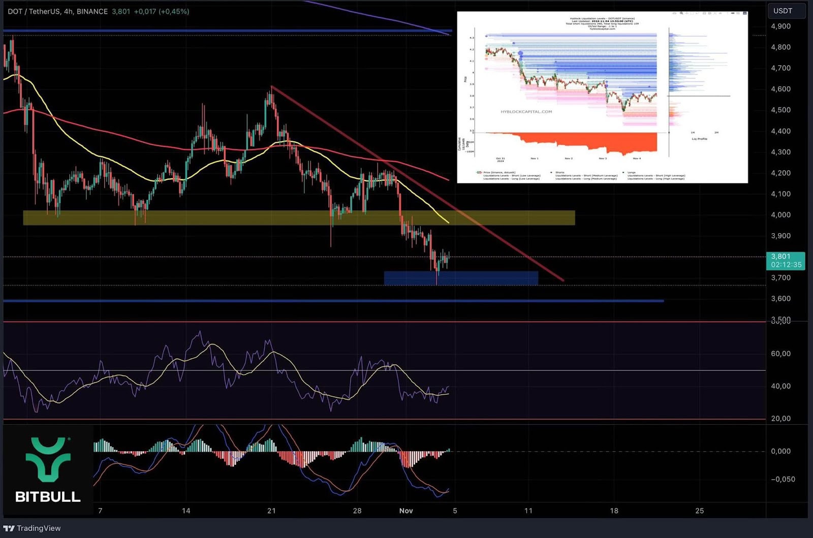 Wie bei den meisten Altcoins verzeichnet auch DOT derzeit eine deutliche Abwärtsbewegung, die auf die Korrektur bei Bitcoin zurückzuführen ist, nachdem dieser fast das Allzeithoch erreicht hatte. Im Tageschart zeigt sich, dass DOT zunehmend vom 50er Daily EMA nach unten gedrückt wird. Die erste Voraussetzung für eine Trendumkehr wäre daher ein Durchbruch des 50er EMA. Der Widerstandsbereich bei 4,2 US-Dollar, in dem der 50er Daily EMA verläuft, markiert zudem den Punkt mit dem höchsten Volumen gemäß VPVR (Visible Range Volume Profile, das Handelsvolumen auf spezifischen Preisniveaus darstellt). Sollte Polkadot diesen Bereich erreichen, wird ein Durchbruch aufgrund des erhöhten Verkaufsdrucks schwer zu erzielen sein, und ein Abverkauf könnte erfolgen. Die gelbe Box dient in diesem Fall als potenzieller Support.