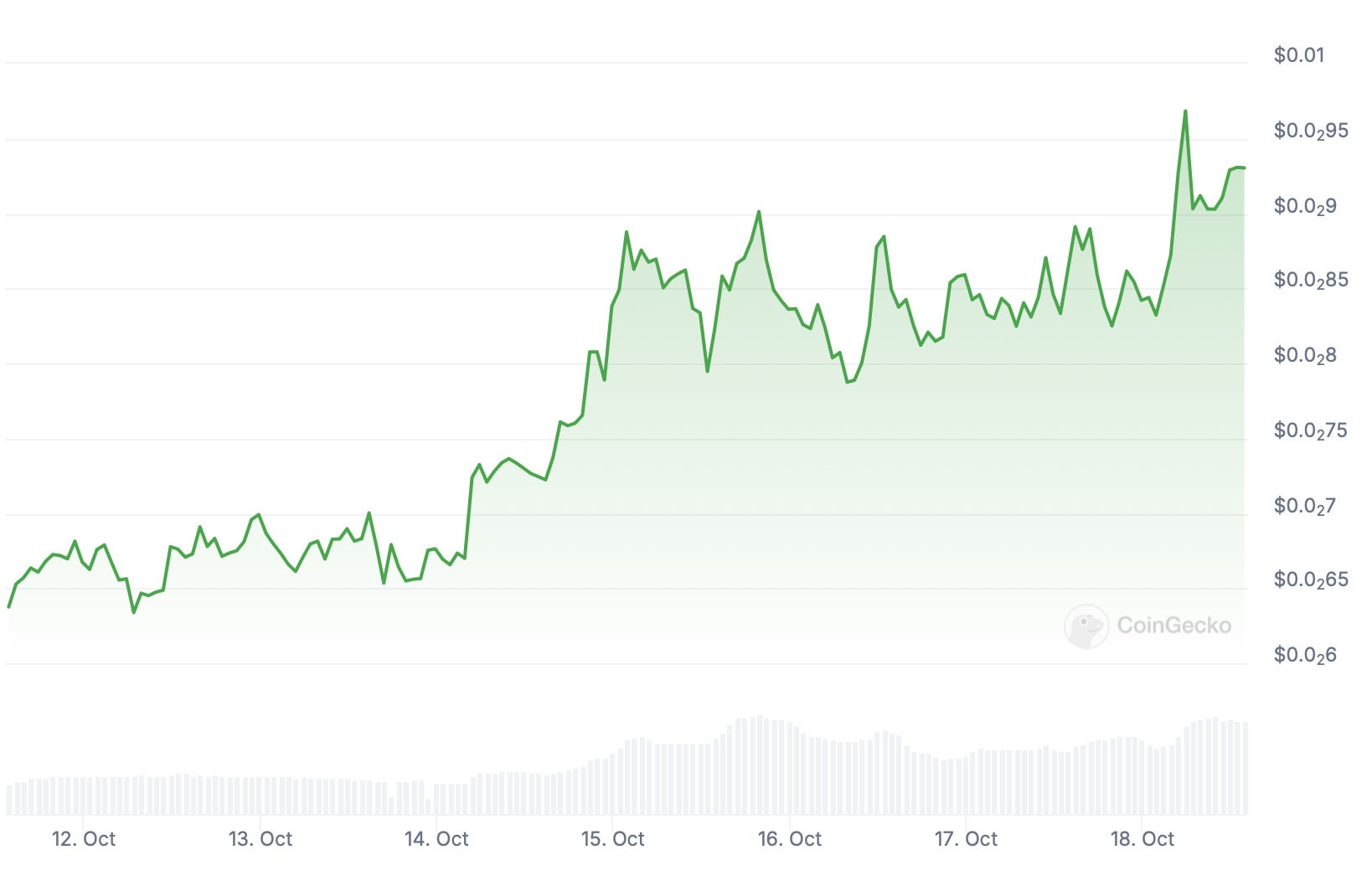 Auch in dieser Woche schafft es Popcat wieder unter die Gewinner der Woche. Der immer beliebtere Solana Memecoin legte einen raketenhaften Start hin und markierte am 12. Oktober ein erneutes Allzeithoch bei 1,54 US-Dollar. Der Rest der Woche verlief weiter stark volatil – der Verkaufsdruck am Hochpunkt ließ den Kurs schnell absacken. Derzeit notiert Popcat bei 1,36 US-Dollar und zeigt sich wieder im grünen Bereich. Die Marktkapitalisierung stieg auf solide 1,3 Milliarden US-Dollar an.