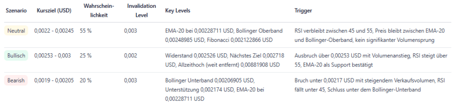 Ein nachhaltiger Ausbruch über 0,00253 USD bei erhöhtem Volumen aktiviert das bullishe Szenario, ein Schluss unter 0,00217 USD würde das bärische Szenario wahrscheinlicher machen. Du solltest Positionen kurzfristig mit engen Stopps am EMA‑20 und den genannten Support‑Levels managen.