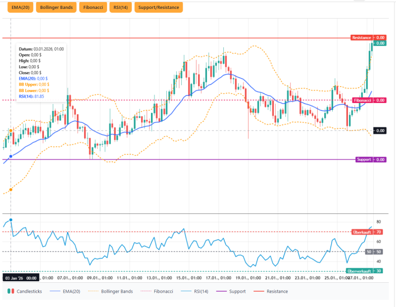 Das aktuelle Kursgeschehen zeigt ein hohes Tempo. Der Anstieg erfolgte schnell, was darauf hindeutet, dass viele Marktteilnehmer zuletzt in kurzer Zeit eingestiegen sind. Dadurch wirkt der Markt kurzfristig etwas überhitzt. Gleichzeitig spricht die Dynamik dafür, dass die Aufwärtsbewegung noch nicht vollständig ausgelaufen ist, auch wenn zwischendurch kleinere Rücksetzer möglich sind.