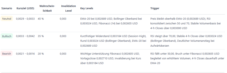 Der Kursverlauf der letzten Stunden deutet auf einen kurzfristigen Aufwärtstrend hin. Rücksetzer fielen zuletzt moderat aus, während neue Hochs erreicht wurden. Solange sich der Kurs oberhalb der Niveaus der vergangenen Tage hält, bleibt das Bild positiv. Wichtige Unterstützungszonen liegen im Bereich um 0,00260 bis 0,00271 US-Dollar. Auf der Oberseite stellt das jüngste Hoch bei rund 0,00318 US-Dollar die nächste Hürde dar.