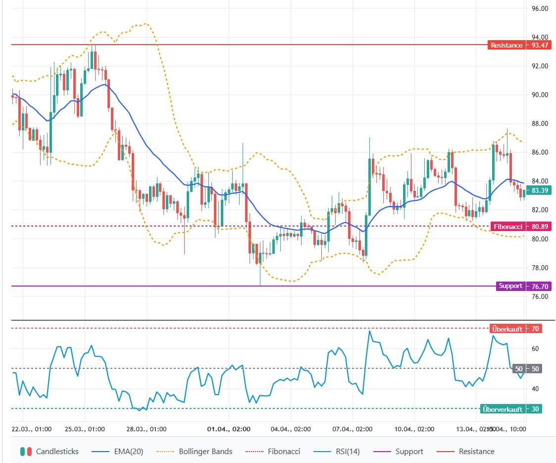 Der Kurs notiert knapp unter dem EMA-20 (83,86 US-Dollar), leicht unterhalb des kurzfristigen Trendfilters. Die jüngste Sequenz bildet eine Folge von tieferen Hochs und tieferen Tiefs seit dem 14. April von 87,67 US-Dollar auf aktuell rund 83,39 US-Dollar. Wichtige Unterstützungen liegen bei 82,65 US-Dollar (tagesnahe Tiefs) und 80,89 US-Dollar (Fibonacci), Widerstände bei EMA-20 von 83,86 US-Dollar und 84,14 US-Dollar; kurzfristig ist die Marktlage neutral bis leicht bärisch.