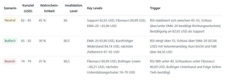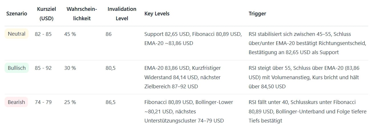 Ein sauberer Ausbruch über 84,50 US-Dollar mit Bestätigung über EMA-20 würde das bullishe Szenario eröffnen, ein Bruch unter 80,89 US-Dollar würde eine stärkere Abwärtsbewegung auslösen. Wenn ihr kurzfristig agiert, dann achtet auf RSI- und EMA-Kombinationen als Trigger für Einstiege/Exits.