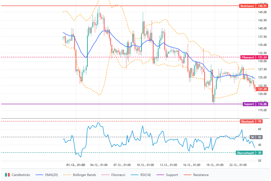Aus technischer Sicht bleibt das Bild belastet. Solana notiert unterhalb des EMA-20 bei 124,60 US-Dollar und bildet kurzfristig eine Abfolge tieferer Hochs und tieferer Tiefs. Dieses Muster spricht für anhaltenden Verkaufsdruck. Auf der Unterseite fungiert der Bereich um 120,63 US-Dollar als erste Unterstützung. Darunter rückt die Zone um 116,88 US-Dollar in den Fokus, die aus dem übergeordneten Abwärtstrend sowie aus dem Fibonacci-Retracement abgeleitet ist. Auf der Oberseite stellen der EMA-20 sowie das jüngste Zwischenhoch bei 125,65 US-Dollar die nächsten relevanten Widerstände dar. Solange Solana unter dem EMA-20 notiert, bleibt die kurzfristige Marktlage bärisch.