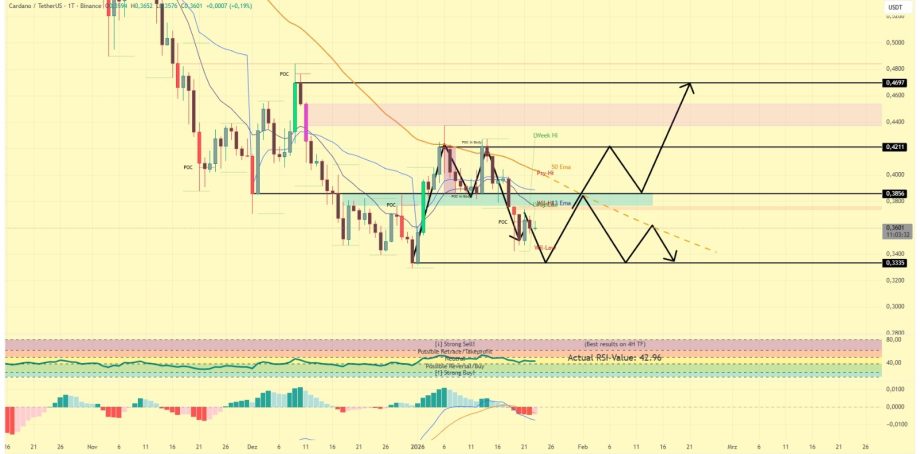In beiden Fällen wäre ein späterer Ausbruch über den 50er EMA ein erstes positives Signal, das ADA zurück in die Preisregion oberhalb von 0,40 US-Dollar führen könnte. Bleibt eine Reaktion hingegen aus oder wird die Unterstützung dynamisch unterschritten, würde sich das übergeordnete Abwärtsszenario fortsetzen und das Chartbild weiter eintrüben.