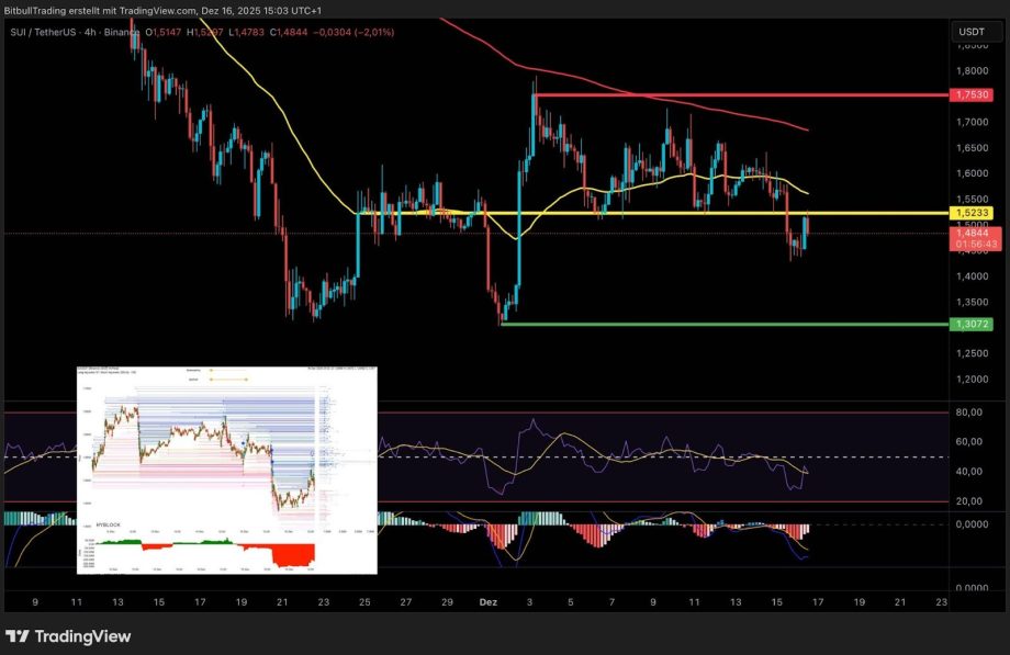 Auch im 4-Stunden-Chart präsentiert sich bei SUI eine insgesamt angespannte Marktstruktur. Der Kurs war nicht in der Lage, die zuvor etablierte kleine Konsolidierungs-Support-Zone auf der Unterseite zu verteidigen. In der Folge scheitert Sui aktuell daran, den Bereich rund um die gelbe Widerstandslinie zurückzuerobern und wird dort bislang klar abgewiesen. Trotz dieser Schwäche ergibt sich kurzfristig ein leicht konstruktives Szenario, sofern das Gesamtmarktumfeld mitspielt. Sollte Bitcoin kurzfristig Stabilität zeigen, besteht bei SUI Potenzial für eine technische Erholung.
