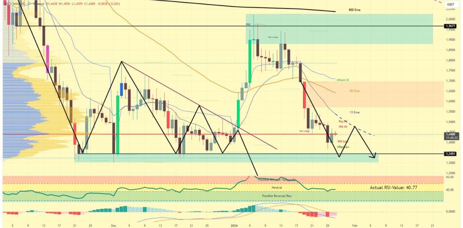 Solange es SUI nicht gelingt, den 13-EMA nachhaltig zu überwinden, erhöht sich die Wahrscheinlichkeit, dass der Kurs erneut nach unten abdreht und die zuvor entstandene blaue Vektorkerze anlaufen könnte. Dieses Szenario würde die bestehende Schwäche bestätigen. Sollte hingegen spürbares Momentum in den Markt kommen, wäre ein nachhaltiger Bruch des 13-EMA das erste positive Signal. In diesem Fall wird ein Vierstundenschluss oberhalb von 1,47 US-Dollar entscheidend. Erst darüber würde sich das kurzfristige Chartbild spürbar aufhellen und Raum für eine weiterführende Erholung eröffnen.