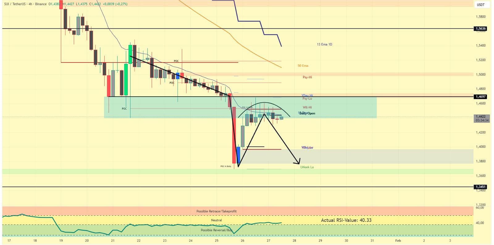 Kurzfristig konnte sich SUI zwar am POC (Point of Control, ein Indikator der das meistgehandelste Preisniveau zeigt) bei rund 1,45 US-Dollar stabilisieren. Diese Reaktion ist jedoch bislang rein technischer Natur und zeigt noch keine Anzeichen nachhaltiger Stärke.