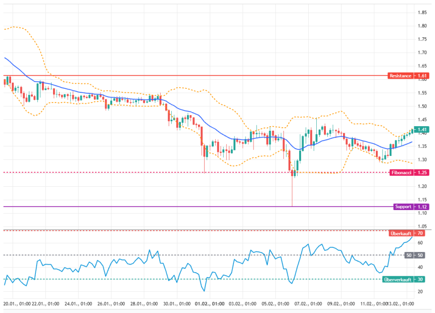 Auf der Unterseite dient das jüngste Verlaufstief bei 1,35 US-Dollar als erste Unterstützung. Darunter rückt der Bereich um 1,33 US-Dollar in den Fokus. Auf der Oberseite stößt der Kurs aktuell an das obere Bollinger-Band bei rund 1,41 US-Dollar, das kurzfristig als Widerstand fungiert. Darüber liegt bei 1,45 US-Dollar eine weitere relevante Marke aus einer vorangegangenen Fibonacci-Bewegung.