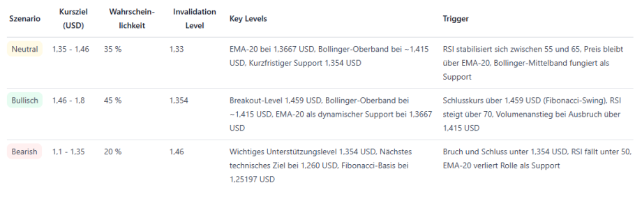Ein nachhaltiger Ausbruch über 1,45 US-Dollar würde die Aufwärtsdynamik verstärken und weiteres Potenzial eröffnen. Fällt der Kurs hingegen unter 1,35 US-Dollar zurück, würde sich das bullishe Szenario deutlich abschwächen. In diesem Fall könnten auch Rücksetzer in Richtung 1,26 US-Dollar möglich werden.