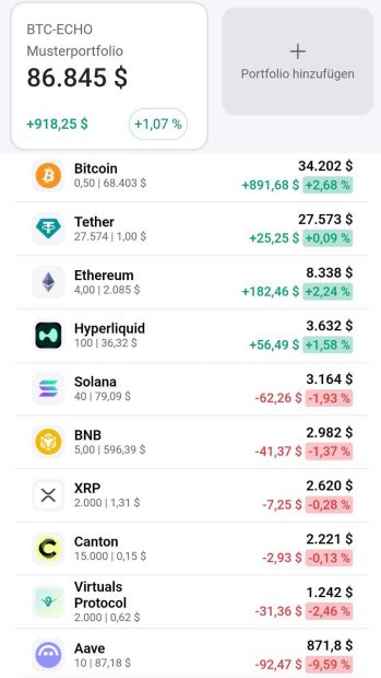 Redaktioneller Hinweis: Mit dem BTC-ECHO-Musterportfolio wollen wir euch eine Hilfestellung geben und bilden alle Kauflevels, Zielmarken und Transaktionen transparent ab – inklusive Historie, Performance-Tracking und strategischer Einordnung. Marktexperte Stefan Lübeck – seit über zehn Jahren als Trader und Chartanalyst tätig – ist der aktive Manager des Portfolios. Dieser Artikel stellt keine Anlageberatung dar und dient ausschließlich zu Informationszwecken.