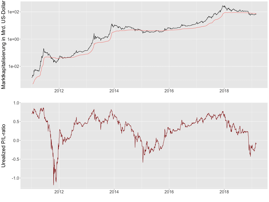 Die Marktkapitalisierung kann gemeinsam mit der realen Kapitalisierung zur Abschätzung von Marktzyklen verwendet werden. Man könnte betrachten, wie die Differenz der beiden Werte ist. Würde es keine Hodler geben, sondern alle Coins ständig bewegt werden, wäre die reale Kapitalisierung gleich der Marktkapitalisierung. Je länger Coins zurückgehalten werden, desto mehr steigt der Unterschied zwischen Markt- und realer Kapitalisierung. Aus der Differenz dieser beiden Größen müsste man etwas lernen können. Eine Art Kaufkraft oder ähnliches müsste sich dadurch anzeigen lassen. Tuur Demester hat mit einigen Kollegen von Adamant Capital deshalb eine Größe namens Unrealized-Profit-Lossentwickelt. Sie ist die Differenz von Marktkapitalisierung und realer Kapitalisierung. Teilt man diese Größe noch durch die Marktkapitalisierung, ist das Ergebnis ein Indikator, der die Marktstimmung einfängt. Die Unrealized-P/L-Ratio ist in der unteren Abbildung unter der Markt- und realen Kapitalisierung eingetragen: