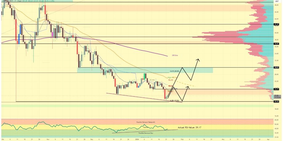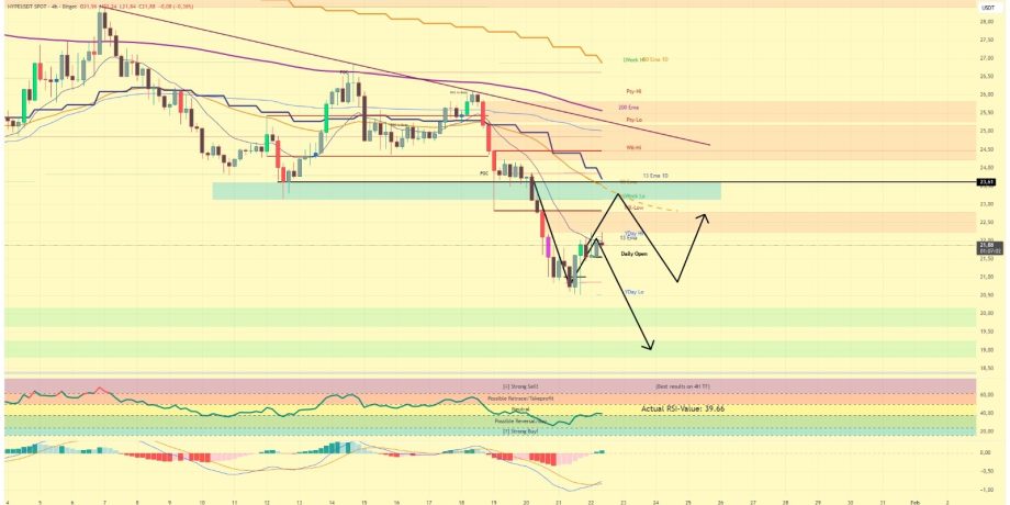 Im 4-Stunden-Chart zeigt der HYPE Kurs erste Anzeichen einer technischen Stabilisierung, bleibt jedoch weiterhin in einer sensiblen Entscheidungsphase. Nach dem jüngsten Abverkauf versucht der Kurs aktuell, oberhalb der lokalen Tiefs eine Bodenstruktur auszubilden. Kurzfristig rückt dabei der Widerstandsbereich um 23,30 US-Dollar in den Fokus. In dieser Zone verläuft nicht nur ein markanter horizontaler Widerstand, sondern auch der 50er EMA, der zuletzt mehrfach als dynamische Verkaufszone fungierte. Sollte der Kurs hier erneut nach unten abdrehen, würde dies als Short Confirmation gewertet und den übergeordneten Abwärtstrend weiter bestätigen.