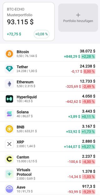 Das vollständige Portfolio könnt ihr euch in der BTC-ECHO App kostenlos selbst nachbauen. Dafür müsst ihr einfach die BTC-ECHO App im App Store oder Google Play Store herunterladen und im Reiter “Portfolio” alle oben gezeigten Coins hinzufügen.