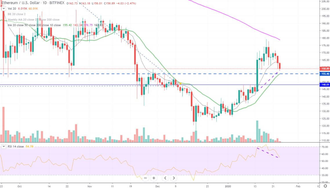 Auch Ethereum musste Federn lassen. Seit dem letzten Peak bei 178 US-Dollar fiel der Ether-Kurs um rund 12 Prozent. Aktuell bewegt sich der Kurs in Richtung des gleitenden Mittelwerts über 20 Tage. Hier könnte er einen Support finden. Wie bei Bitcoin macht jedoch auch hier die bearishe Divergenz zwischen Bitcoin-Kurs und RSI Sorgen.