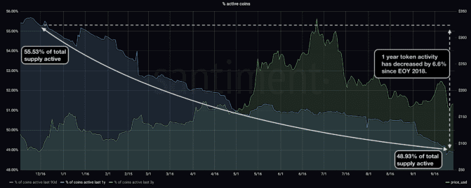 Eine interessante On-Chain-Größe ist die Token-Aktivität. Diese misst, wie viele Token in einem bestimmten Zeitraum bewegt wurden. Es gibt gute Gründe für die Annahme einer Antikorrelation zwischen der Anzahl aktiver Token und etwaigen Kursbewegungen. Am Beispiel von Ethereum wurde jüngst festgestellt: