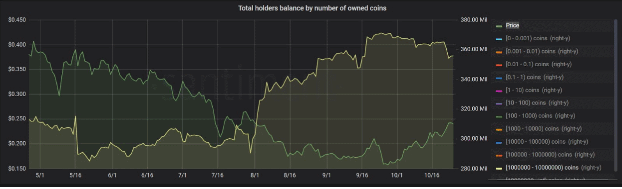 Und BAT? Für den Basic Attention Token kann dasselbe gesagt werden: Im letzten Quartal akkumulierten die Wallets mit zehn bis hundert Millionen BAT insgesamt über 60 Millionen BAT. Das entspricht einem Zuwachs von ungefähr 20 Prozent an Token: