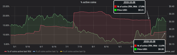Ein anderes Beispiel für dieses Verhalten lässt sich bei 0x sehen. Der ZRX-Kurs stieg um 13 Prozent in Zeiten, als die Anzahl der in den letzten 90 Tagen aktiven Coins sank: