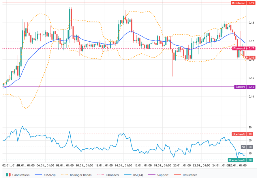 Der Kurs notiert unter dem EMA-20 (0,1689 US-Dollar), was kurzfristig bärisches Momentum signalisiert. Die jüngste Sequenz zeigt überwiegend tiefere Hochs und tiefere Tiefs; unmittelbare Unterstützung bei 0,1607 US-Dollar, darunter relevanter Bereich bei 0,1509 US-Dollar (Fibonacci-Start). Widerstände liegen am EMA-20 (0,1689 US-Dollar) und am jüngsten Swing-High bei 0,1754 US-Dollar. Solange der Kurs unter dem EMA-20 bleibt, ist die Lage neutral bis leicht bärisch.