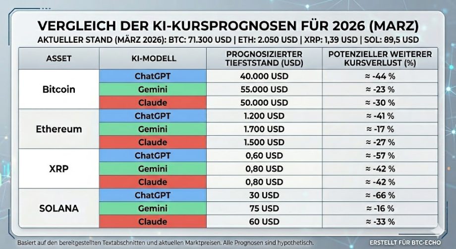 Der Krypto-Markt befindet sich in einer tiefen Depression. Seit Anfang Oktober sind rund zwei Billionen US-Dollar an Marktkapitalisierung aus Bitcoin, Ethereum und den großen Altcoins geflossen, während unter Anlegern “extreme Angst” herrscht. Zwar zeigte sich der Markt zuletzt im Zuge des Iran-Konflikts leicht erholt, ausgerechnet während die Aktienmärkte unter Druck geraten. Doch reicht das für eine Trendwende? Wie groß ist das weitere Abwärtspotenzial für Bitcoin, Ethereum und Co. und welche Kursmarken rücken nun in den Vordergrund? BTC-ECHO hat die Top-KI-Modelle ChatGPT, Gemini und Claude AI um ihre Prognosen gebeten, inklusive möglicher Worst-Case-Szenarien.