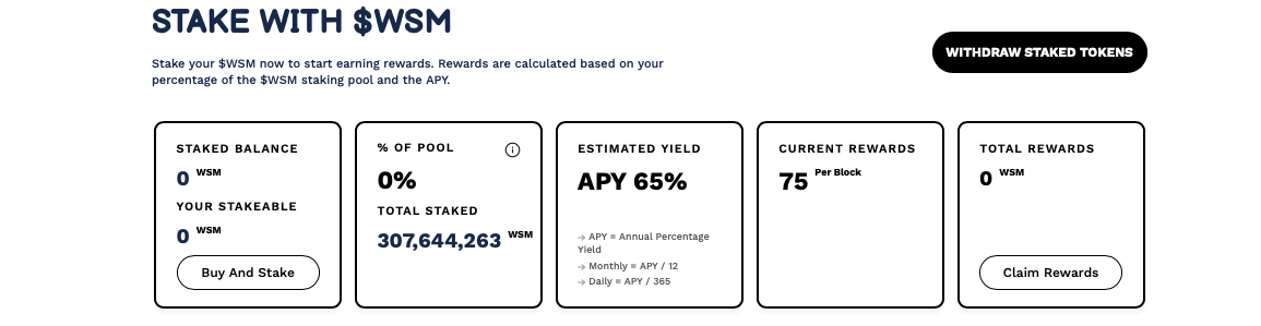 Aktuell wurden bereits 307 Millionen Token im Staking-Contract gesperrt, insgesamt belief sich der Presale-Anteil auf 1 Milliarde Token. Die dynamische APY beträgt immer noch 65 %. Diese wird allerdings weiter sinken, sobald mehr WSM in das Staking eingebracht werden. Dennoch dürfte dies für die WSM-Halter wünschenswert sein, da das handelbare Angebot immer weiter verknappt wird.