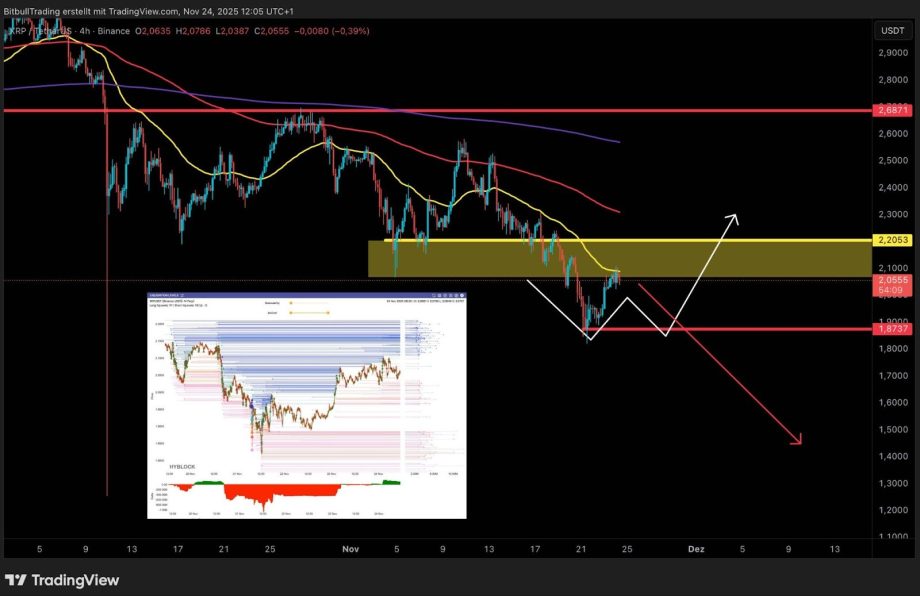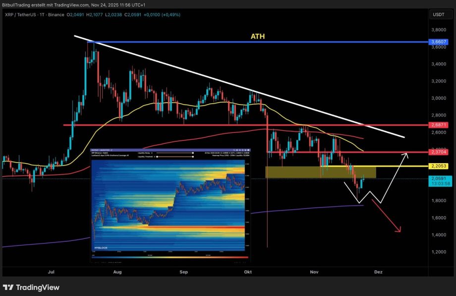 Im Tageschart trifft XRP derzeit auf die gelbe Widerstandszone, einen Bereich, an dem der Kurs bereits mehrfach gescheitert ist. Sollte es dem Markt erneut nicht gelingen, diese Zone zu überwinden, steigt die Wahrscheinlichkeit eines weiteren Abverkaufs deutlich. In diesem Fall rückt die darunterliegende Unterstützungszone in den Fokus, denn dort müsste XRP ausreichend Stabilität entwickeln, um ein mögliches W-Pattern auszubilden, das als klassisches bullish wirkendes Umkehrsignal gilt.