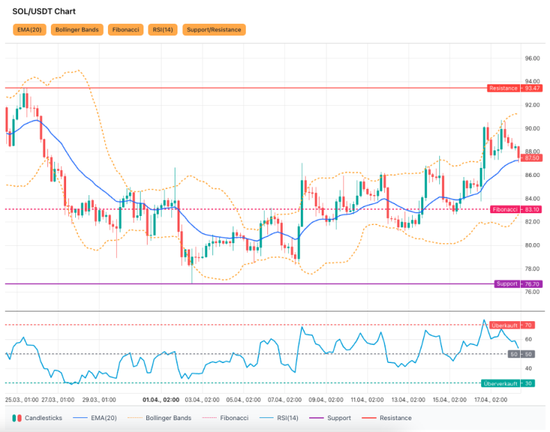 Die kurzfristige Prognose für SOL am 18. April ist neutral; Kurs und Momentum zeigen keine klare Trendfortsetzung. Unterstützungen: 87,10 US-Dollar (tagesnah) und 83,10 US-Dollar (Fibonacci); Widerstände: 89,95 US-Dollar und 90,73 US-Dollar. Ein nachhaltiger Ausbruch über 90,73 USD mit voluminöser Bestätigung könnte als bullisches Signal gelten und Kurse in Richtung 95,00 US-Dollar eröffnen. Fällt der Kurs nachhaltig unter 83,10 US-Dollar, ist mit beschleunigter Abwärtsbewegung in Richtung 78,00 US-Dollar zu rechnen.