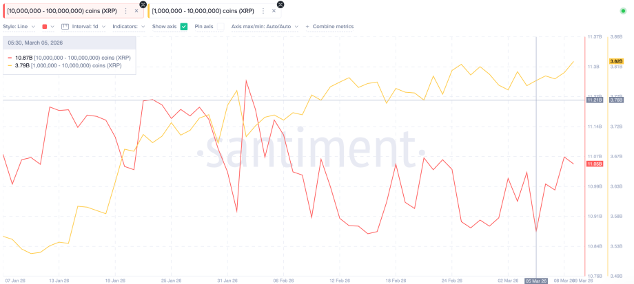 Daten von Santiment zeigen, dass sogenannte Wale ihre Bestände zuletzt ausgebaut haben. Wallets mit 1 bis 10 Millionen XRP haben ihre Bestände in den vergangenen Wochen um rund 30 Millionen XRP erhöht. Gleichzeitig haben größere Wallets mit 10 bis 100 Millionen XRP ihre Bestände sogar um etwa 180 Millionen XRP ausgebaut. Dieses Verhalten zeigt, dass einige große Marktteilnehmer die aktuellen Kursniveaus offenbar als Gelegenheit zur Akkumulation betrachten.