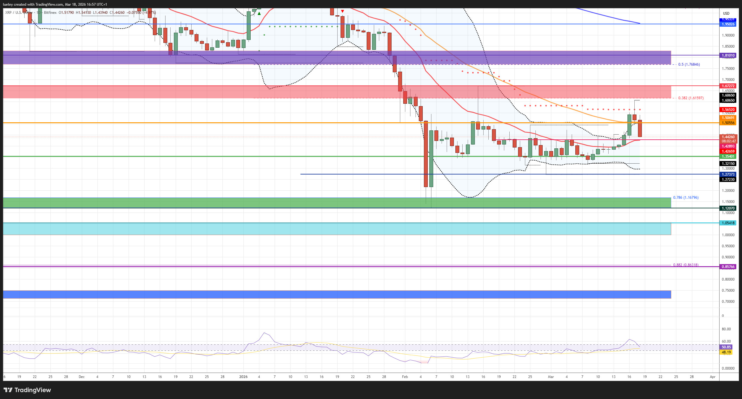 Der Kursausbruch von Ripple (XRP) scheint vorerst verschoben. Ausgehend vom Wochenhoch bei 1,60 US-Dollar korrigierte die Kryptowährung um acht Prozentpunkte auf 1,46 US-Dollar und konnte die Rückeroberung der 50-Tagelinie nicht bestätigen. Damit folgt der Altcoin der Krypto-Leitwährung Bitcoin (BTC), die wenige Stunden vor der Fed-Leitzinsentscheidung ebenfalls schwächer tendiert. Ob die bullishe Trendfortsetzung gelingen kann oder eine weitere Hängepartie droht, dürfte primär von folgenden Chartmarken abhängig sein.