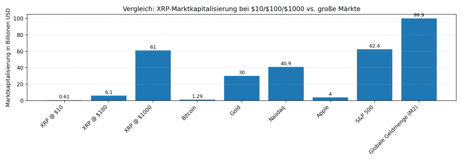 Ein XRP-Kurs von 10 US-Dollar entspräche einer Marktkapitalisierung von rund 610 Milliarden US-Dollar – ambitioniert, aber nicht völlig unrealistisch. Bei 100 US-Dollar würde XRP jedoch auf etwa 6,1 Billionen US-Dollar steigen und damit Vermögenswerte wie Gold überholen. Ein Kurs von 1.000 US-Dollar würde XRP auf rund 61 Billionen US-Dollar katapultieren.