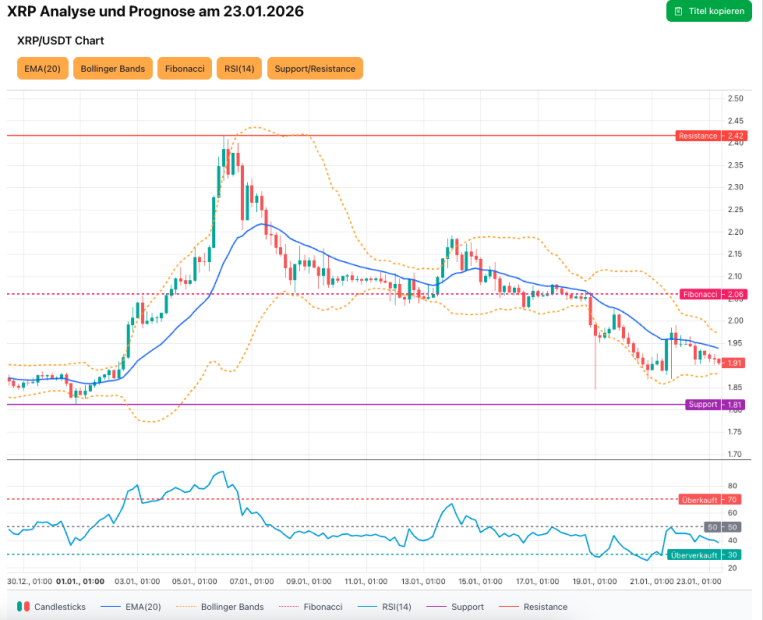 Die kurzfristige Prognose für XRP am 23. Januar ist neutral bis leicht bärisch. Unterstützungen: 1,88 US-Dollar (Bollinger-Unterband) und 1,85 US-Dollar (Fibonacci-Tief); Widerstände: EMA-20 bei 1,94 US-Dollar und 1,95 US-Dollar. Ein nachhaltiger Ausbruch über 1,94 US-Dollar mit Volumenanstieg würde kurzfristig 1,98 bis 2,20 US-Dollar als Ziel freimachen. Bricht der Kurs unter 1,88 US-Dollar, beschleunigt sich der Abwärtsdruck Richtung 1,85 US-Dollar. Anleger sollten das Jahr 2026 und die weitere Entwicklung im Blick behalten.