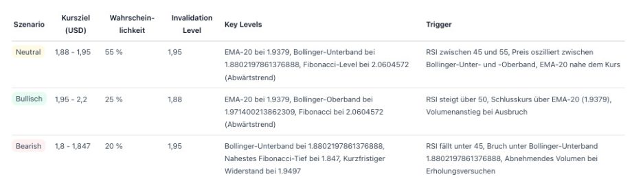 Der Kurs notiert unter dem EMA-20 (1,94 US-Dollar) und zeigt eine Folge von teils tieferen Hochs und zuletzt tieferen Tiefs, was kurzfristige Schwäche signalisiert. Wichtige Unterstützungen liegen bei 1,88 US-Dollar (Bollinger-Unterband) und dem Fibonacci-Tief bei 1,85 US-Dollar; Widerstände bei EMA-20 1,94 US-Dollar und 1,95 US-Dollar (letztes Hoch). Solange der Kurs unter dem EMA-20 verbleibt, bleibt die Marktlage neutral bis leicht bärisch.
