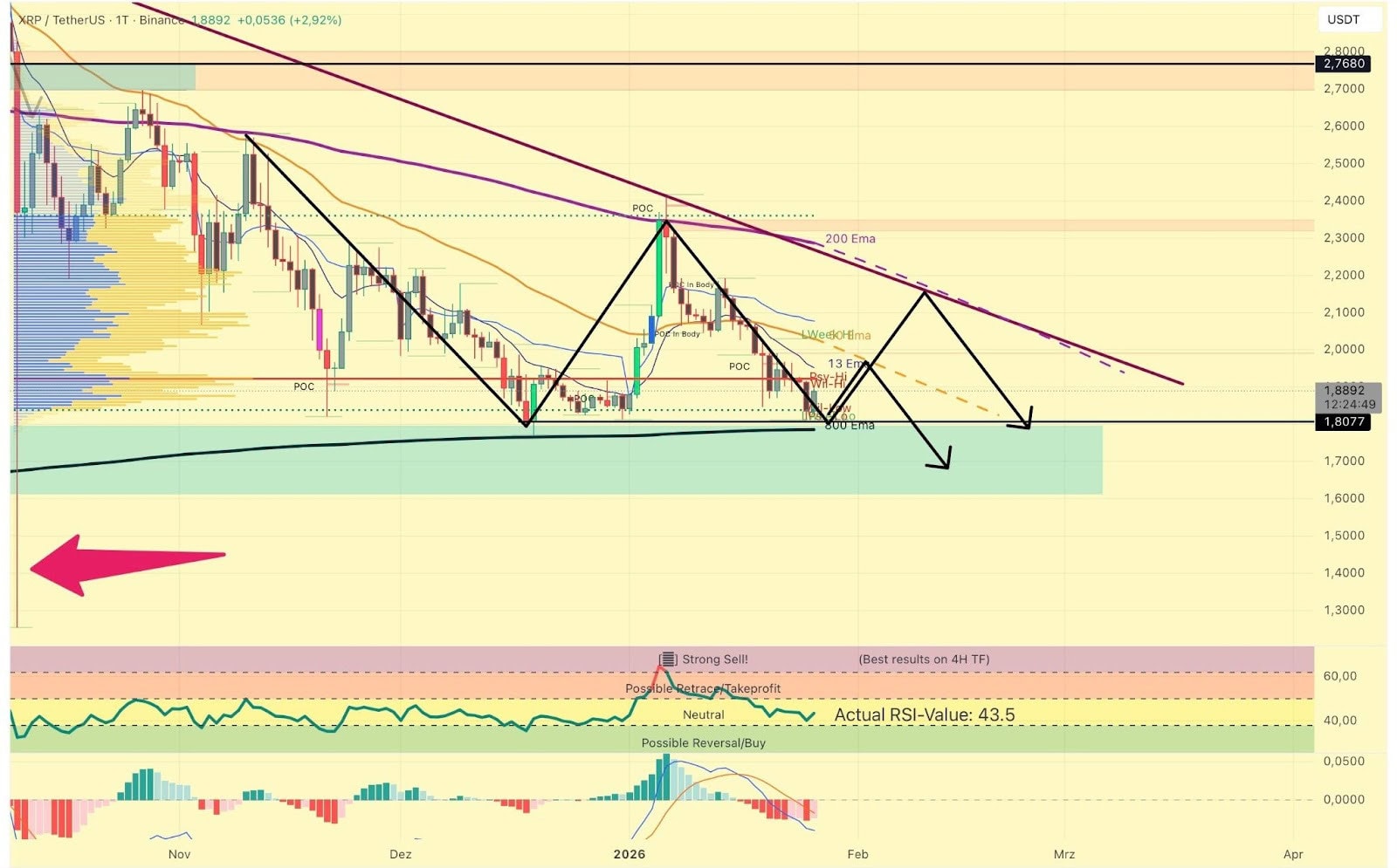 Gelingt es XRP dennoch, den Widerstand bei 1,89 US-Dollar zu überwinden, eröffnet sich Raum für einen weiteren Anstieg bis in den Bereich um 1,93 US-Dollar. Dort warten mit dem 50er-EMA sowie dem 13er Daily EMA gleich zwei relevante technische Hürden, die das Aufwärtsmomentum begrenzen dürften.