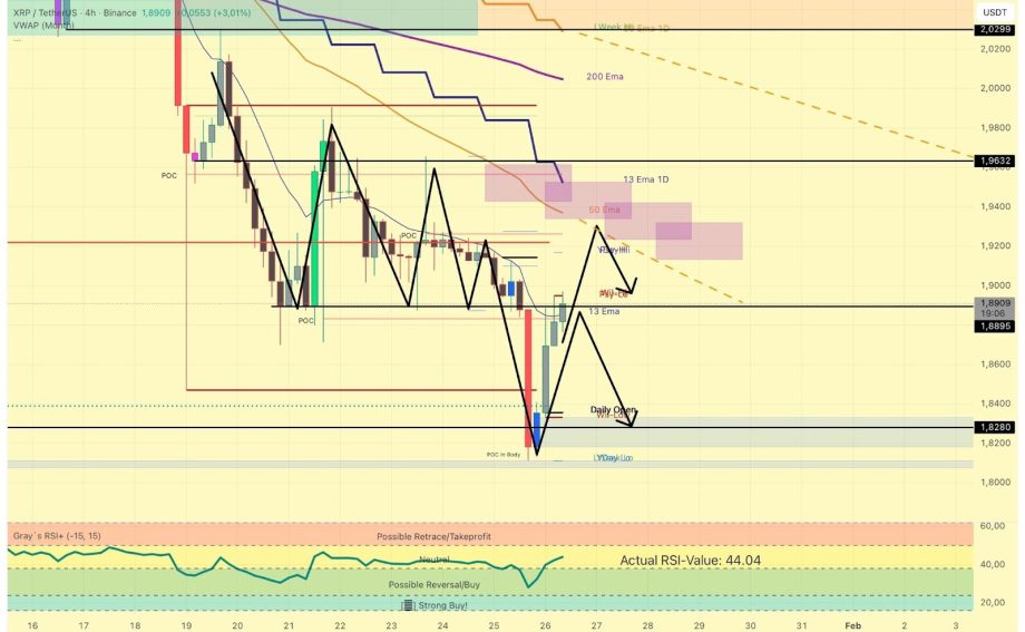 Auch im 4-Stunden-Chart bleibt XRP technisch angeschlagen. Der Kurs bewegte sich zuletzt in einer klaren absteigenden Struktur, aus der er zunächst mit einer roten Vektorkerze bearishe Dynamik entwickelte. Im Anschluss folgte jedoch eine V-förmige Erholung, die den Kurs zurück an die aktuelle Widerstandszone bei rund 1,89 US-Dollar führte.