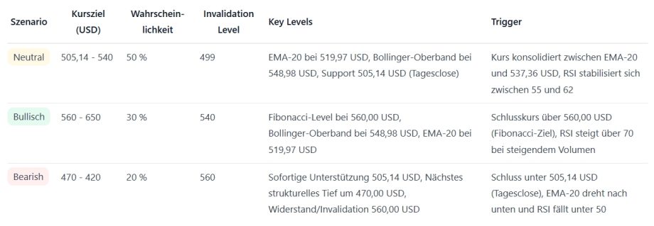 Der RSI liegt bei etwa 61,5 und signalisiert robustes Kaufmomentum ohne klare Überkauftheit. Das MACD‑Histogramm zeigt positive, aber leicht nachlassende Beschleunigung. Die Bollinger‑Bänder weisen eine Breite von rund 44,86 USD auf (Oberband 548,98 USD / Unterband 504,11 USD), was erhöhte, aber nicht extreme Schwankungen bedeutet. Der Markt befindet sich in einer angespannten Trendphase mit steigender Volatilität.