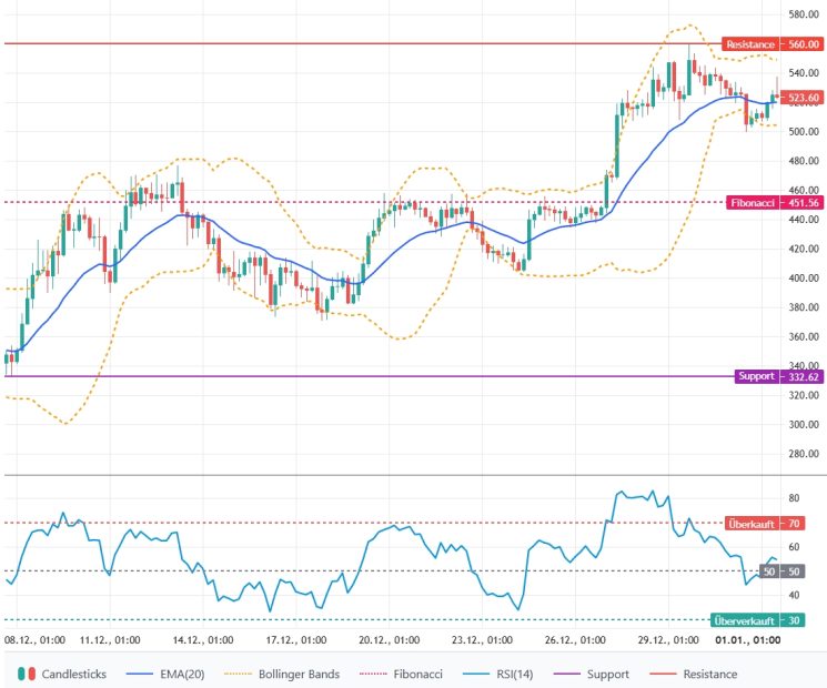 Der Kurs notiert oberhalb des EMA‑20 (519,97 USD) und bildet seit dem Rebound Ende Dezember eine Sequenz höherer Hochs und höheren Tiefs. Kurzfristige Unterstützungen liegen bei 519,97 USD (EMA‑20) und 505,14 USD (Tagesclose); Widerstände bei 537,36 USD (24h‑High) und 560,00 USD (Fibonacci‑Ziel). Solange der Kurs über dem EMA‑20 verbleibt, ist die Marktlage technisch bullish.