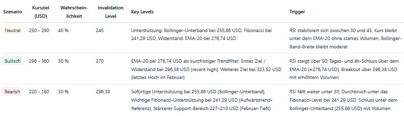 Der Kurs notiert deutlich unter dem EMA-20 (276,74 US-Dollar) und bildet jüngst eine Sequenz aus tieferen Hochs und tieferen Tiefs, was die kurzfristige Schwäche bestätigt. Naheliegende Unterstützung liegt am Bollinger-Unterband bei 255,86 US-Dollar, gefolgt von der Fibonacci-Unterstützung bei 241,29 US-Dollar; Widerstände finden sich beim EMA-20 (276,74 US-Dollar) und beim jüngsten Swing-High bei 296,38 US-Dollar. Solange der Kurs unter dem EMA-20 verbleibt, ist die Marktlage kurzfristig bearisch.
