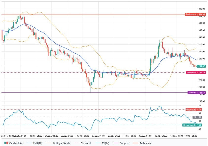 Der 14er-RSI liegt bei rund 30,16 und signalisiert nahe überverkaufte Verhältnisse. Das Histogramm zeigt eine leichte Beschleunigung nach oben in den letzten Kerzen, was auf kurze Erholungsversuche hindeutet. Die Bollinger-Bänder haben aktuell eine Breite von ca. 52,51 US-Dollar (Upper 308,37 US-Dollar / Lower 255,86 US-Dollar), was erhöhte, aber keine extreme Schwankungsintensität bedeutet. Der Markt befindet sich in einer angestrengten Korrekturphase mit erhöhtem Risiko für schnelle Preisbewegungen, solange der Kurs unter dem EMA-20 bleibt.