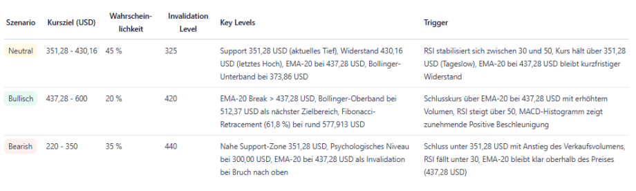 Kurzfristig lautet die Prognose neutral bis bärisch: Momentum ist schwach, Volatilität erhöht und der Kurs bleibt unter dem EMA-20. Wichtige Unterstützungen liegen bei 351,28 USD (aktuelles Tief) und 320,00 USD (psychologisches Rundlevel), Widerstände bei 430,16 USD (letztes Hoch) und am EMA-20 bei 437,28 USD. Ein Durchbruch über 437,28 USD würde das kurzfristige Verkaufsdruck-Szenario abschwächen und eine Erholung Richtung 500 bis 600 USD ermöglichen, während ein Bruch unter 351,28 USD zu beschleunigtem Abgabedruck und Zielen um 220 bis 330 USD führen könnte. Für Anleger ist jetzt rigides Risikomanagement nötig; positive Signale erfordern einen klaren Schluss über EMA-20 mit Volumenbestätigung.