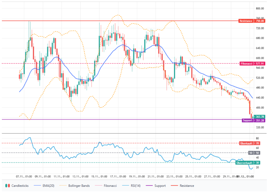 In den letzten 12 bis 24 Stunden bewegte sich der Kurs in einer Spanne zwischen 351,28 USD (Tief) und 430,16 USD (Hoch) basierend auf den letzten 3 bis 6 4h-Candles. Der aktuelle Schlusskurs liegt bei 363,78 USD und damit deutlich unter dem Schlusskurs des Vortags (427,94 USD), was einen starken Tagesverlust zeigt. Die Marktkapitalisierung beträgt ca. 5,9 Milliarden US-Dollar. Kurzfristig dominierte ein scharfer Abwärtsimpuls mit erhöhten Spreads zwischen den Kerzen.