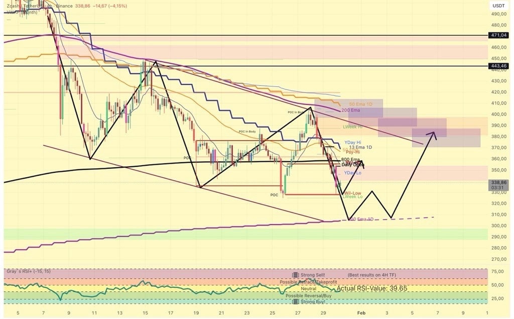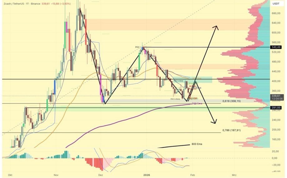 Sollte es in diesem Bereich zu einer Stabilisierung kommen, richtet sich der Blick auf den 50-Tage-EMA. Ein nachhaltiger Durchbruch über diese gleitende Durchschnittslinie wäre ein wichtiges Signal für eine Fortsetzung der übergeordneten Struktur. In diesem Szenario steigt die Wahrscheinlichkeit, dass ZEC erneut das Hoch im Bereich um 540 US-Dollar ins Visier nimmt. Gelingt es hingegen nicht, den Bereich um 300 US-Dollar zu verteidigen, würde sich das technische Bild spürbar eintrüben. Unterhalb dieser Zone öffnet sich aus Sicht des Volumenprofils Raum bis in den nächsten signifikanten Handelsbereich bei rund 250 US-Dollar, wo erneut mit erhöhter Liquidität zu rechnen ist.