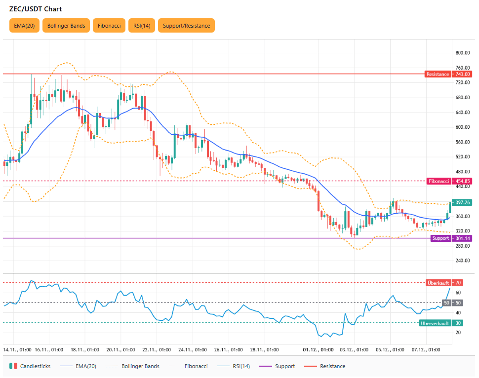 Kurzfristig bleibt die Prognose für Zcash (08.12.2025) bullisch, solange der Kurs über dem EMA-20 (356,02 USD) notiert. Unterstützungen: 368,44 USD und 356,02 USD (EMA-20); Widerstände: 398,38 USD und ca. 409,32 USD.