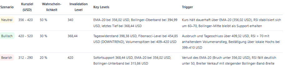 Ein stabiler Ausbruch über 409,32 USD würde weiteres Anstiegspotenzial eröffnen; ein Rutsch unter 356,00 USD würde das bullische Szenario deutlich schwächen. Für Dich als Anleger heißt das: Favorisiere bei Long-Positionen diszipliniertes Risikomanagement nahe des genannten Supports.