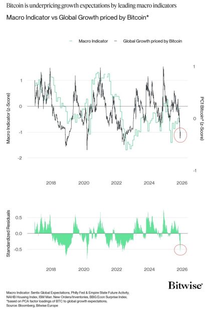- Ein Blick auf die Daten offenbart jedoch eine massive Diskrepanz. Dragosch vergleicht die globalen Wachstumserwartungen, basierend auf Makro-Daten von Sentix, ISM und der Philly Fed, mit den im Bitcoin-Preis implizierten Signalen.