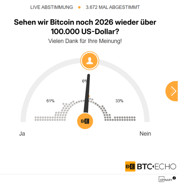 Ja, nein, vielleicht? Ob der Bitcoin-Kurs in diesem Jahr wieder ein sechsstelliges Niveau erreicht, darüber gehen die Einschätzungen unter Experten stark auseinander. Ein relativ klares Bild zeichnet sich dagegen in der wöchentlichen Umfrage von BTC-ECHO ab.