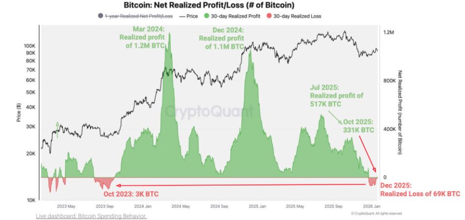 - Bitcoin-Anleger realisieren erstmals seit Oktober 2023 wieder netto Verluste. Laut Onchain-Analysehaus CryptoQuant hat sich die Gewinnphasein eine Verlustphase gedreht. Insgesamt wurden seit Ende Dezember 2025 Verluste von bis zu 69.000 BTC realisiert.
